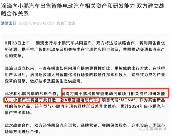 第一,首先是出售智能电动车项目资产和研发能力,不是滴滴和小鹏合作造车。