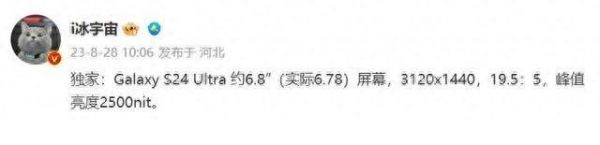 近日,有关三星Galaxy S24 Ultra手机的屏幕参数曝光。据知名博主@i 冰宇宙透露,Galaxy S24 Ultra将配备6.8英寸(实际为6.78英寸)的显示屏,分辨率为3120*1440,屏幕比例为19.5:5,峰值亮度高达2500nit。该博主过去的爆料准确性较高,因此这些信息具有较高可信度。