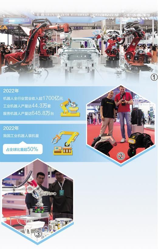 图①:沈阳新松机器人汽车点焊工作站。 张晨霖摄 图②:工作人员指导观众操作轮足机器人。 翁奇羽摄 图③:观众在参观一款拾放抓手装置。 翁奇羽摄 数据来源:2023世界机器人大会