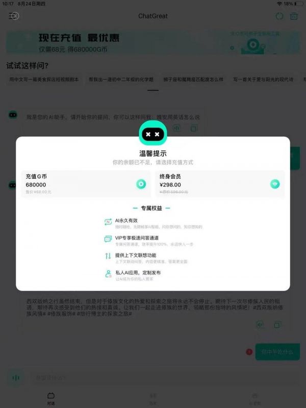 《IT时报》记者随机下载了ChatGreat,在体验一次提问之后,界面弹出温馨提示:“你的余额不足,请选择充值方式。”一种为充值G币,68元一次;另一种为终身会员,需花费268元,可享受“无限提问”“VIP快速通道”等4项服务。