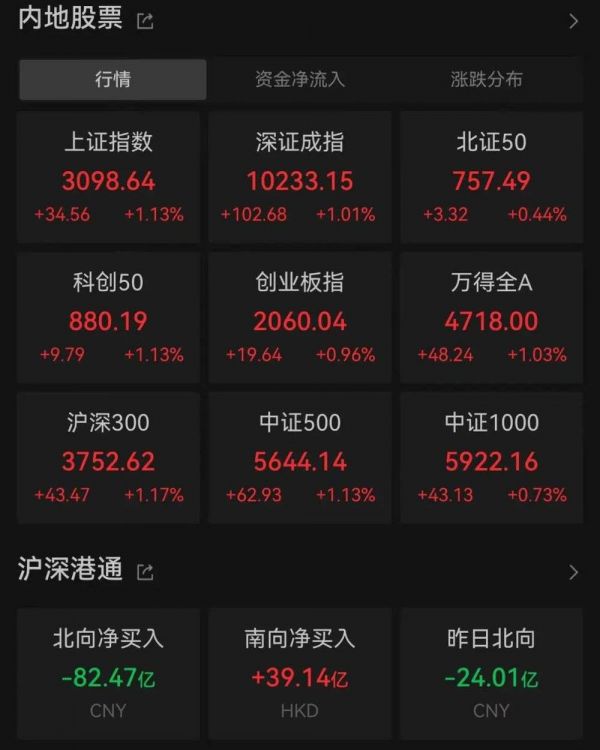 8月28日开盘,三大指数集体爆发,均涨5%以上。截至收盘,沪指涨1.13%,收报3098.64点;深成指涨1.01%,收报10233.15点;创业板指涨0.96%,收报2060.04点。全市场上涨个股超3600家,其中41家涨停。资金方面,Wind数据显示,截至收盘,沪深两市今日成交额11266亿,较上个交易日放量3603亿,不过北向资金卖出超80亿。