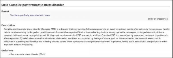 ICD-11中关于复杂性创伤后应激障碍(CPTSD)的描述: