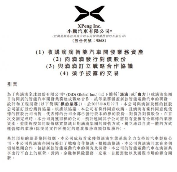 8月28日周一,小鹏汽车公告称,基于预期的显著协同效应,本公司成为首家获得滴滴生态系统全力支持的汽车制造公司,本公司与滴滴亦同时签订了战略合作协议。