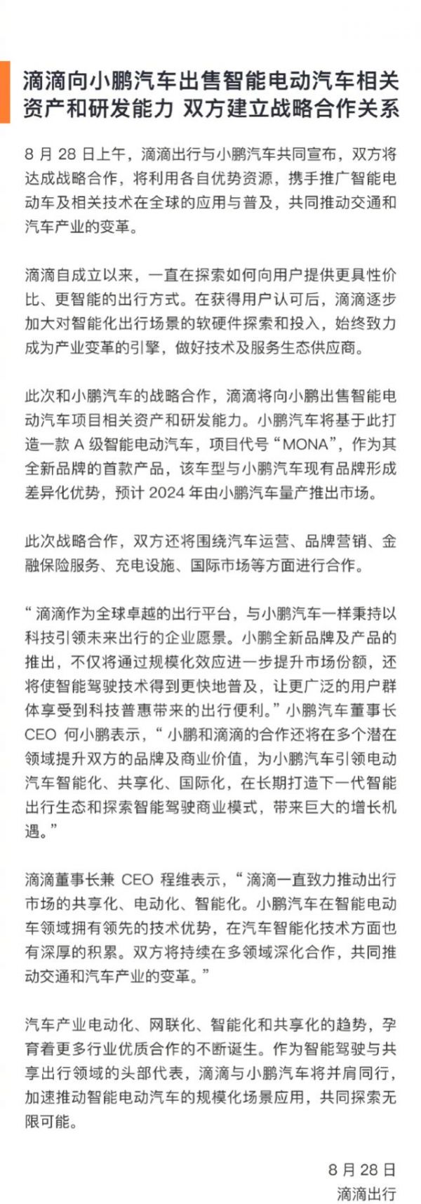 同日,据滴滴出行官博,滴滴出行与小鹏汽车共同宣布,双方将达成战略合作。滴滴将向小鹏出售智能电动汽车项目相关资产和研发能力。小鹏汽车将基于此打造一款A级智能电动汽车,项目代号“MONA”,作为其全新品牌的首款产品,该车型与小鹏汽车现有品牌形成差异化优势,预计2024年由小鹏汽车量产推出市场。