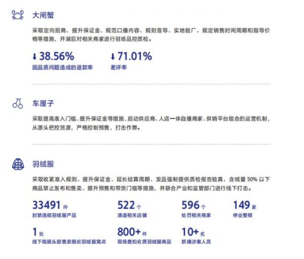 尤其针对季节性高风险产品,抖音电商也出台了相应的保障措施。例如对大闸蟹商家展开定向招商、提升保证金、规范口播、实地验厂等措施,截至目前,抖音电商大闸蟹产品因质保问题导致的退货率降低38.56%,差评率降低71.01%。还有羽绒服,抖音电商提升了带货门槛,要求含绒量50%以下的商品禁止发布售卖,同时还封禁了33491款违禁产品,清退相关店铺522个,处罚商家596个。