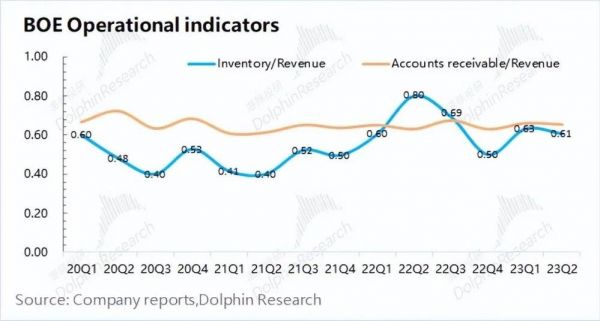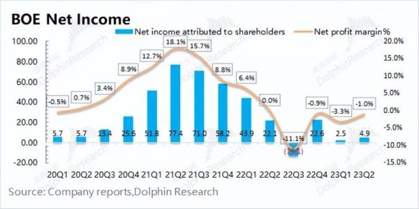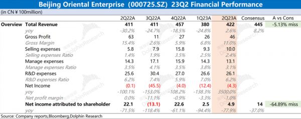 其中京东方在2023年第二季度总营收422亿元,同比增长2.6%。虽然公司二季度营收开始止跌回升,但仍低于市场预期(445亿元)。