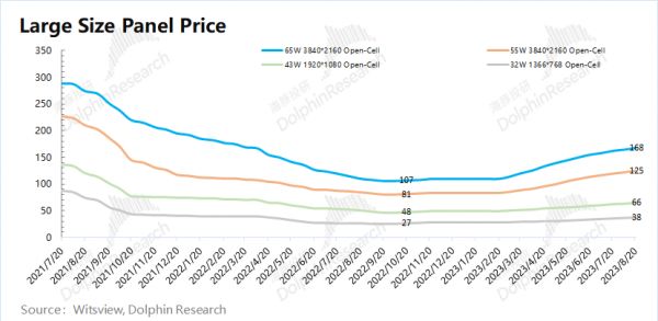 从Witsview的8月下旬报价来看,65寸/55寸/43寸/32寸价格分别为168美金/125美金/66美金/38美金。各尺寸面板价格,已经从底部上涨有40%以上。