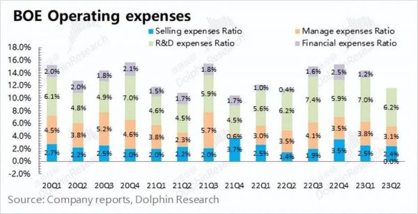 2023年第二季度京东方四项费用合计48.98亿元,同比增加3.6%。四项费用率11.6%,四项费用率相对稳定,各项费用互有增减。