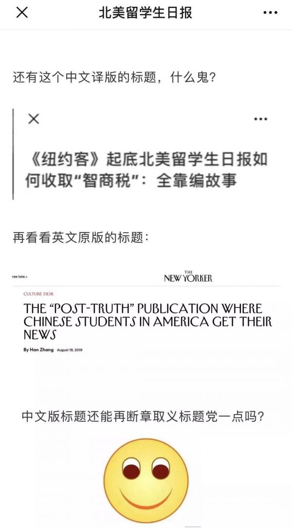 纽约客最近刊发了一篇关于这个公号的报道,文章很长,这里有一个中译本:《纽约客》起底北美留学生日报如何收取“智商税”:全靠编故事。