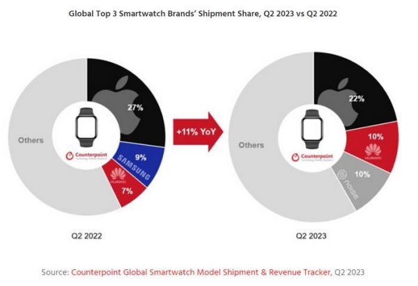 2023Q2 全球智能手表报告:苹果同比下降 10%、华为国内增长 58%