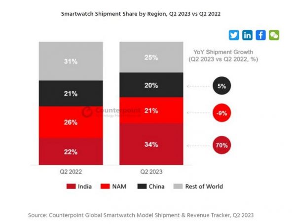 报告称该季度印度市场出货量同比增长 70%,是全球市场反弹的主要力量。而中国市场整体而言不瘟不火,不过华为推出了 Watch 4 等系列新旗舰产品,让其在第 2 季度出货量同比增长 58%,刷新了自 2020 年以来的单季出货量最高纪录。