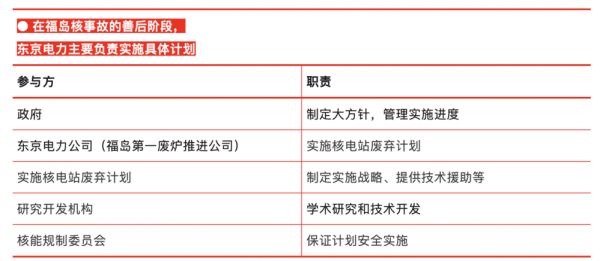 目前,有五方共同参与了福岛第一核电站废炉作业。核电站废止工作包括处理污染水、取出乏燃料棒、处理熔毁堆芯等。日本政府负责制定大方针并监督实施,而东京电力公司负责具体实施。日本政府在 2021 年 4 月决定了将核废水排放至大海的基本方针。
