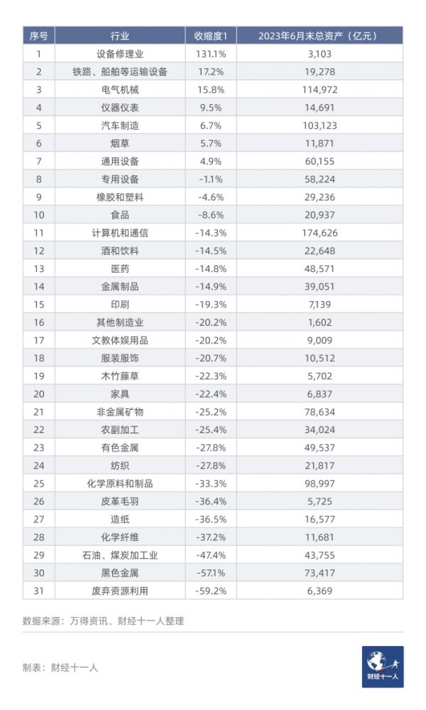 上文说过,在31个行业中,总资产超过3万亿的“大行业”有13个,其中有9个“大行业”在收缩: