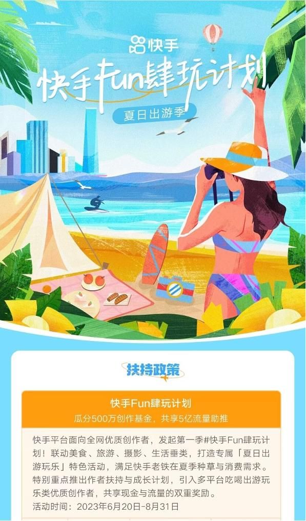 为了进一步扶持泛生活垂类的创作者,快手在此前还发起了第一季快手Fun肆玩计划,从6月20日至8月31日,投入500万创作基金与5亿流量双重加持,联动萌宠、美食、旅游、摄影、生活等5大泛生活垂类,打造专属夏日出游玩乐的特色活动。