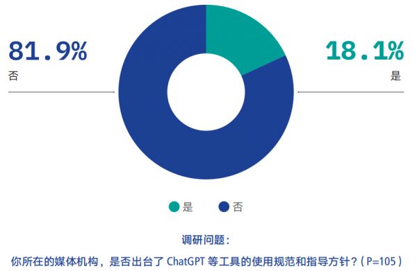 值得注意的是,ChatGPT对新闻生产的影响还体现在从业人员对ChatGPT的不规范使用,容易引发抄袭、信源不清等问题。而根据我们的调研,大部分(81.9%)媒体机构都没有出台ChatGPT等工具的使用规范和指导方针。这是需要重视的现实问题。