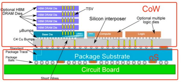 CoWoS由CoW和oS组合而来:CoW表示Chip on Wafer,指裸片在晶圆上被拼装的过程,oS表示on Substrate,指在基板上被封装的过程。
