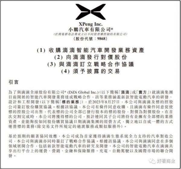 在资本层面,小鹏将收购滴滴的智能汽车开发业务,包括新款智能电动汽车的研发、设计和工程开发。