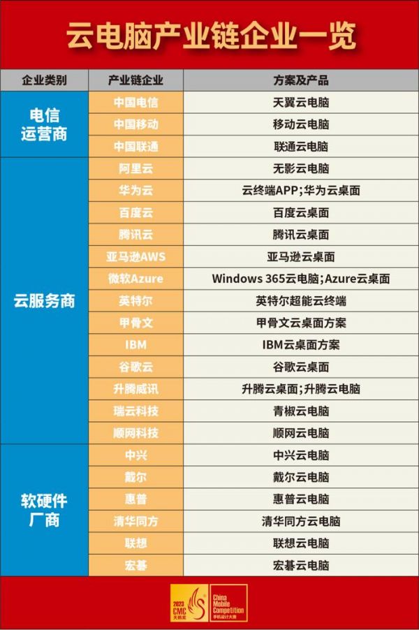 在电信运营商杀入市场之前,公有云企业是云电脑最早的探路者之一,目前国内头部云计算企业,包括阿里云、华为云、百度云、腾讯云都在该领域有所布局。