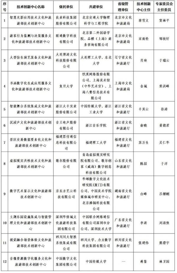 名单由文化和旅游部提供首批文化和旅游部技术创新中心建设名单主要涉及演艺装备、游乐设施、智慧旅游与景区建设、艺术显示与交互体验、文化数字化与智能化等特色鲜明、应用性强的场景,依托单位既有行业知名企业,又有国内重点高校。建设期不超过1年,建设完成后将按程序组织验收。