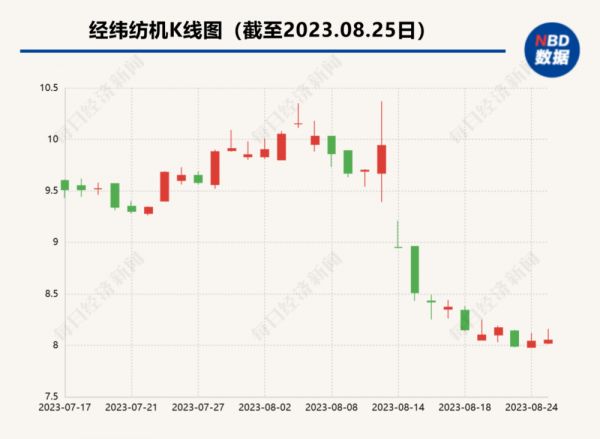 此前,在8月14日,该公司股价突然跌停,随后几天又持续下跌。数据显示,8月14日至8月25日期间,经纬纺机的股价累计下跌了19%,市值缩水至57亿元。截至发稿,经纬纺机股价为8.05元。