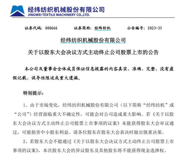 2023年8月26日,国机集团出具《关于同意实施经纬纺机主动退市的批复》,同意经纬纺机以股东大会决议方式实施主动退市,同意恒天集团提供现金选择权。