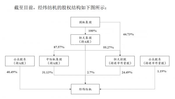 据经纬纺机公告,公司总股本为7.04亿股,其中流通A股为5.23亿股,退市外资股为1.81亿股。其中,中纺机集团持有经纬纺机2.19亿股A股股份,占经纬纺机总股本的比例为31.13%。恒天控股持有经纬纺机1.72亿股退市外资股股份,占经纬纺机总股本的比例为24.49%。恒天集团持有经纬纺机1901万股A股股份,占经纬纺机总股本的比例为2.70%。