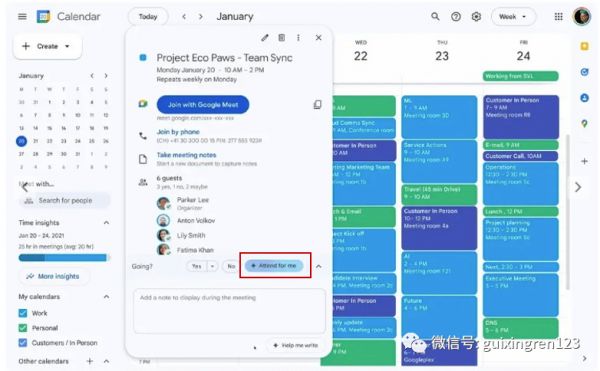 如果你有事不能参加会议,在日历会议安排中,除了说“No”之外,你还有了一个“AI替我参会”的新选项。你可以把你想要在会议中表达或者想要了解的问题告诉Duet AI,AI助手则会在会议期间向参会者传递这些信息,并将得到的反馈和答案记录下来方便你查阅。