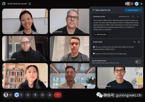 首先,Duet AI 推出了“为我做笔记”功能,能够实时捕获笔记、操作项和视频片段,这些笔记可以保存到 Google 文档,并在会议结束后作为摘要发送给与会者。如果你迟到了,你进入会议后还可以看到AI整理的 “到目前为止的摘要”,快速了解参加前的会议内容。