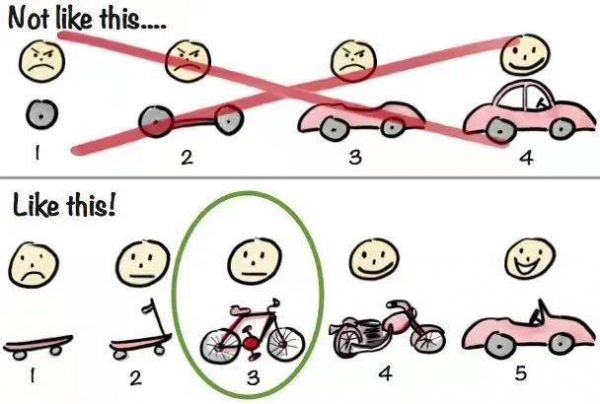 4. 没办法,资源有限,这种路径是深思熟虑之后的平衡。但同时,我也坚信,资源有限不是坏事,它确实可以倒逼我们思考什么是重要的。Notion 的迭代路径,也让我想起来一张曾经在产品圈子里流传的图片。