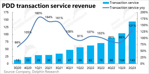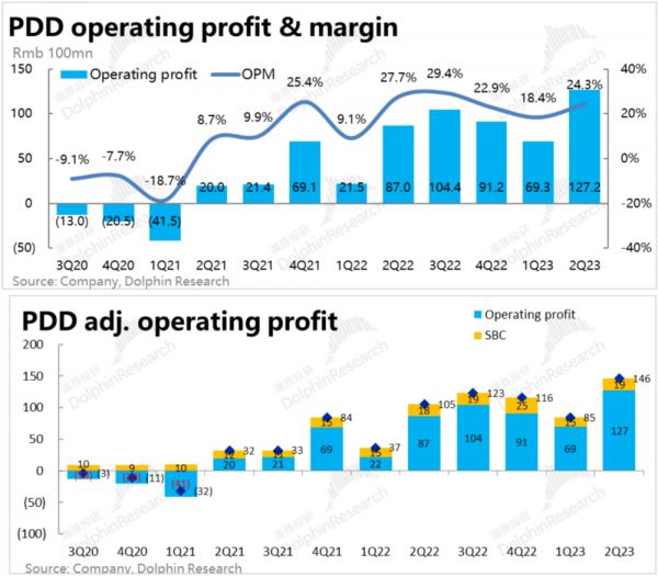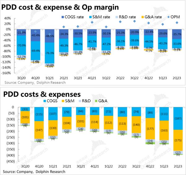 本季度拼多多的营销费用为175.4亿元,虽然看似高于预期,但实际环比仅增加了不到13亿元(相比之下京东的2Q营销投入则环比增加了近44亿元)。考虑到二季度618大促季的季节性差异,且Temu规模环比成倍增长所需的营销投入势必也非常可观,海豚君认为,拼多多营销费用的增长相比之下反而是最少的,表明竞争并未导致拼多多被迫增加商城主业的推广或补贴。