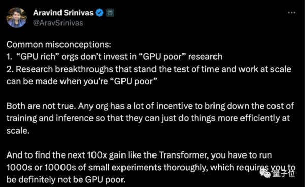 但Perplexity.AI联合创始人Aravind Srinivas认为,GPU丰富的组织实际也会投资于带限制条件的研究。