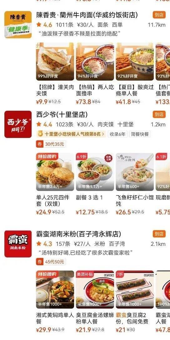 凤凰网财经查看了霸蛮、西少爷、陈香贵等几家中高端快餐,以北京地区为例,它们均推出了特价团购餐,9.9元~29.9元不等,甚至与原价相比便宜了5成左右。