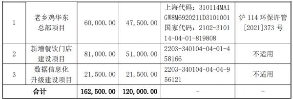 根据此前招股书显示,老乡鸡原拟在上交所主板发行不超过6353万股,拟募集资金12亿元,用于老乡鸡华东总部项目、新增餐饮门店建设项目、数据信息化升级建设项目。