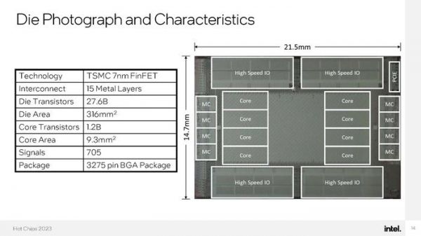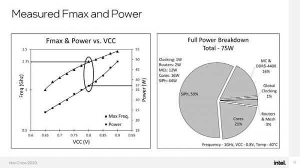 英特尔还展示了其 CPU 的功耗和 Fmax 数据,这颗八核芯片具有 75W 的 TDP,其中大部分功耗用于光子学领域,而内核本身只占用了约 21% 的功耗指标,约为 16W。