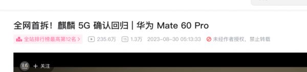 在 B 站上,数条 8 月 30 日凌晨发布的华为 Mate60 Pro 拆解视频,发布后数小时就纷纷冲到两百万级别的播放量。8 月 29 日晚还有不少位于深圳华强北的小型手机维修店铺,用自己买来的 Mate60 Pro 做起了简陋的拆解直播。
