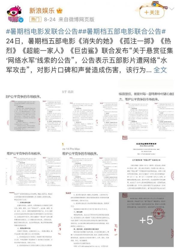 8月25日,#五部暑期档电影联合抵制网络水军#的话题登上微博热搜,原来是《消失的她》《超能一家人》《热烈》《巨齿鲨2:深渊》《孤注一掷》五部影片联合发布了一则《关于悬赏征集“网络水军”线索的公告》,希望有人能提供涉及五部影片“黑水军”的相关线索和证据,一经查实给予总金额不超过300万元的奖励。