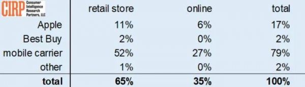 CIRP 认为,导致这一情况出现的主要因素之一是消费者重返线下。据称,美国 iPhone 总销量中有 65% 出现在实体店中,另外 35% 才是在网上。