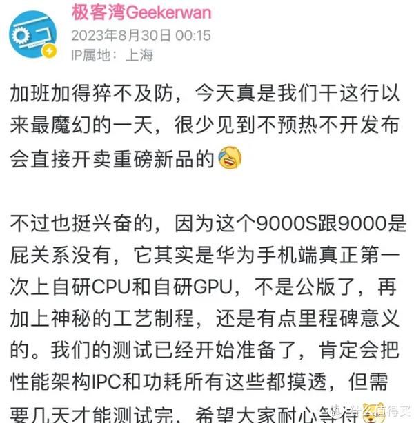 加上极客湾也说了麒麟9000跟麒麟9000s屁关系都没有,更可以确信它是属于华为自己的自研SOC。只是这个制程是多少目前还是个迷,以及具体的性能释放还要看后续的测试结果。