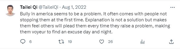 2022年8月,他提及“霸凌”时写道:“在美国,霸凌似乎是一个问题。人们通常不会在第一时间阻止他们。解释并不能解决问题,反而让他们觉得每次提出问题时,别人都会向他们求情,他们夜以继日地寻找借口。”