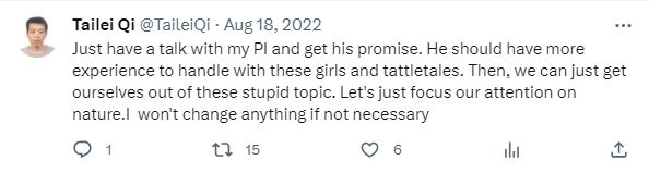 他在推特上写道:“这群人要么说我懒,要么证明我努力工作,而不是告诉我他们试图侵犯我的隐私。我判断他们的动机只是想告诉我的 PI,然后通过讲故事来控制我。但奇怪的是,当我和我的 PI 谈论这件事时,他说没有人跟他谈论过这件事。所以这只是这些人的偷窥行为?”