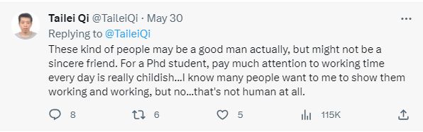 2023年5月,他写道:“对于一个博士生来说,每天关注工作时间实在是太幼稚了……我知道很多人都想让我向他们展示:在工作、一直在工作。但是,不行……那根本就不是人。”