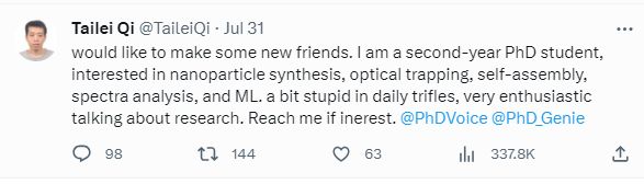 齐太磊在7月31日这天异常活跃,他写道“想结交一些新朋友。我是一名二年级博士生,对纳米粒子合成、光捕获、自组装、光谱分析和机器学习感兴趣。日常琐事上有点傻,谈研究却很热情。如果有兴趣,请联系我。”介绍了团队的新成果。他还提了另一个问题:“什么是真理?”