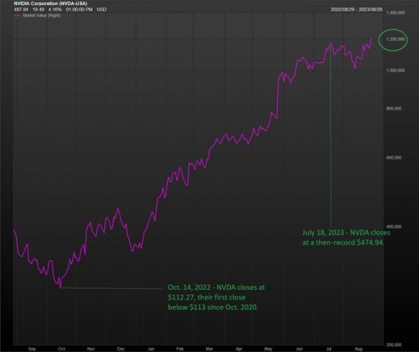 在一年多一点的时间里,英伟达的市值增长了近1万亿美元,自2022年10月14日股价触及低点(2020年8月以来首次收于113美元下方)以来市值增长了9250亿美元。