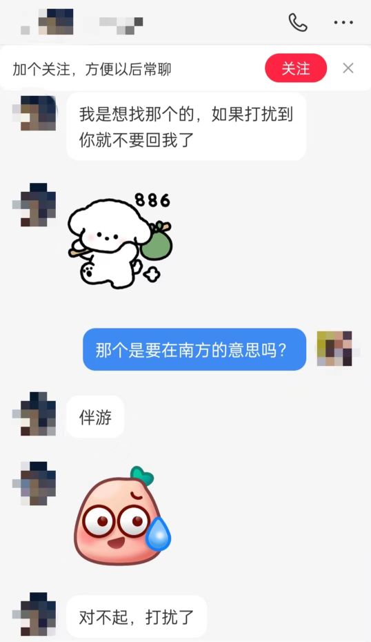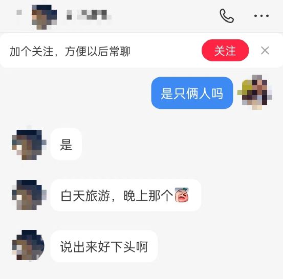 其中,一用户在评论区留言“广州帮扶女大,素质大方吐金币”。凤凰网《风暴眼》联系对方后,询问是否要一起旅游。约好时间地点后,对方称“我是想找那个的,如果打扰到你就不要回我了”“白天旅游,晚上那个”。并称旅游费用对方全出,之所以选用这种方式,是因为觉得更纯粹,不想付出情绪价值。当凤凰网《风暴眼》询问风险时,对方称自己才更担心,怕被仙人跳、被讹钱。