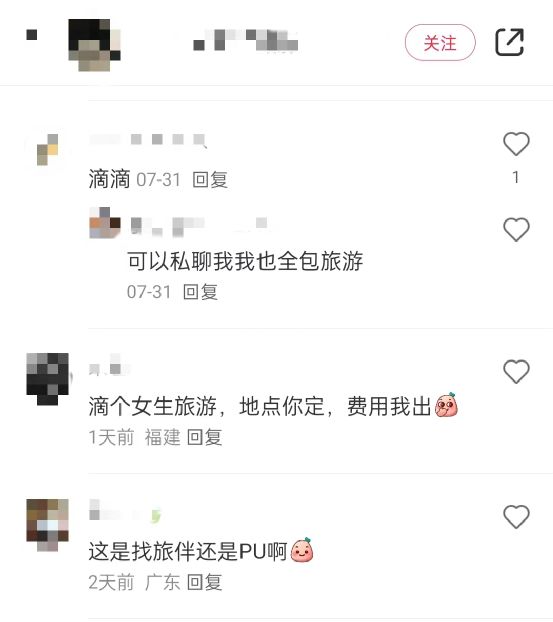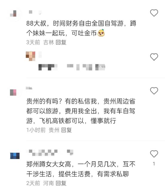 这样的评论留言还有很多,譬如“我找个旅游伴侣,费用全包,每天会吐金币”;“贵州周边省都可以旅游,费用我全出,我有车自驾游,飞机高铁都可以,懂事就行。”“88大叔,时间财务自由全国自驾游,蹲个妹妹一起玩,可吐金币。”这名用户的主页中也含有寻找旅游搭子内容。除了旅游,还有多个寻求长期固定关系的信息,表示“互不干涉生活”。