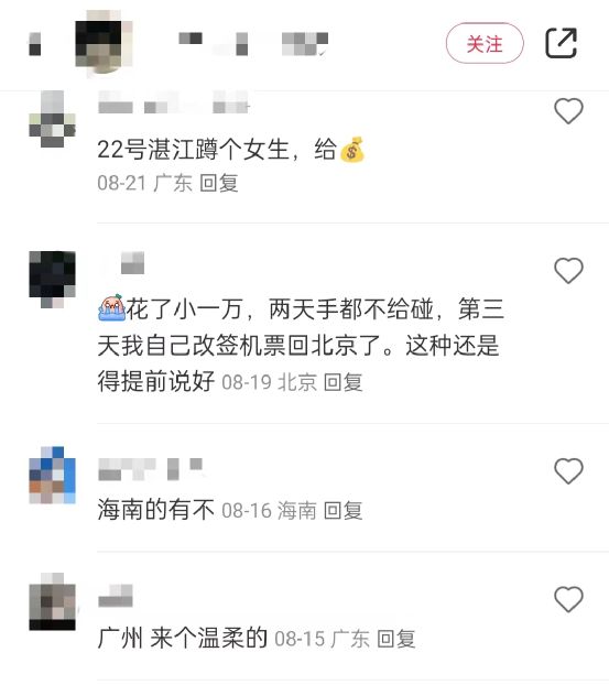 一般而言,这些用户会提前说明非绿诉求,也有人在评论区留下经验之谈:“花了小一万,两天手都不给碰,第三天我自己改签机票回北京了。这种还是得提前说好。”