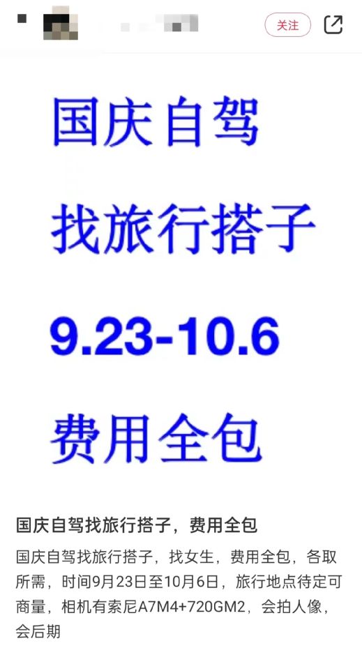 除了比较隐晦的寻求旅游搭子笔记外,还有人表达得更为明目张胆。有小红书用户发布笔记表示,寻求国庆自驾游旅行搭子,找女生,费用全包,并自称会拍人像,会后期。点开他的主页,会发现他还会给女生拍摄私房照,并曾放出自己拍摄的美女照片,以吸引女性关注。
