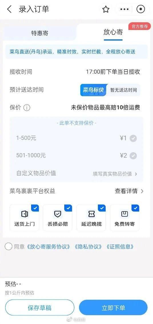 近期,我们注意到,支付宝的“菜鸟裹裹商家寄件”小程序正在试水“放心寄”产品,并且打上了“官方推荐”显著标语。“放心寄”便是由菜鸟直送(丹鸟)承运的菜鸟标快产品。
