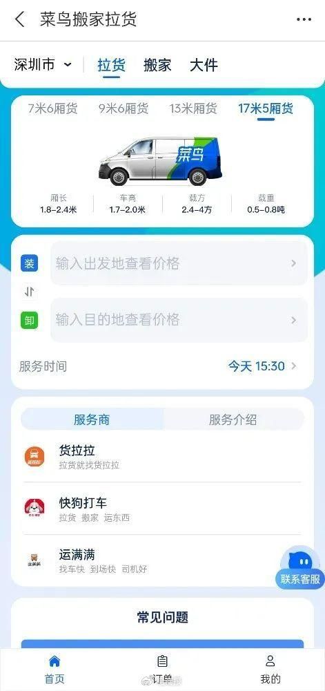 目前,菜鸟裹裹支付宝端已经上线了“菜鸟搬家拉货”入口,提供拉货、搬家、寄大件的服务。