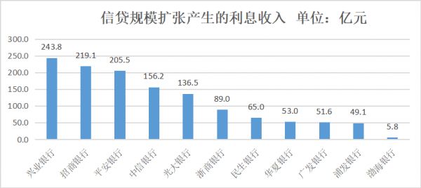 兴业银行、招商银行和平安银行由信贷规模扩张产生的利息收入增量排前三位分别达243.8亿元、219.1亿元和205.5亿元。渤海银行、浦发银行和广发银行由信贷规模扩张产生的利息收入排后三位,分别是5.8亿元、49.1亿元和51.6亿元。